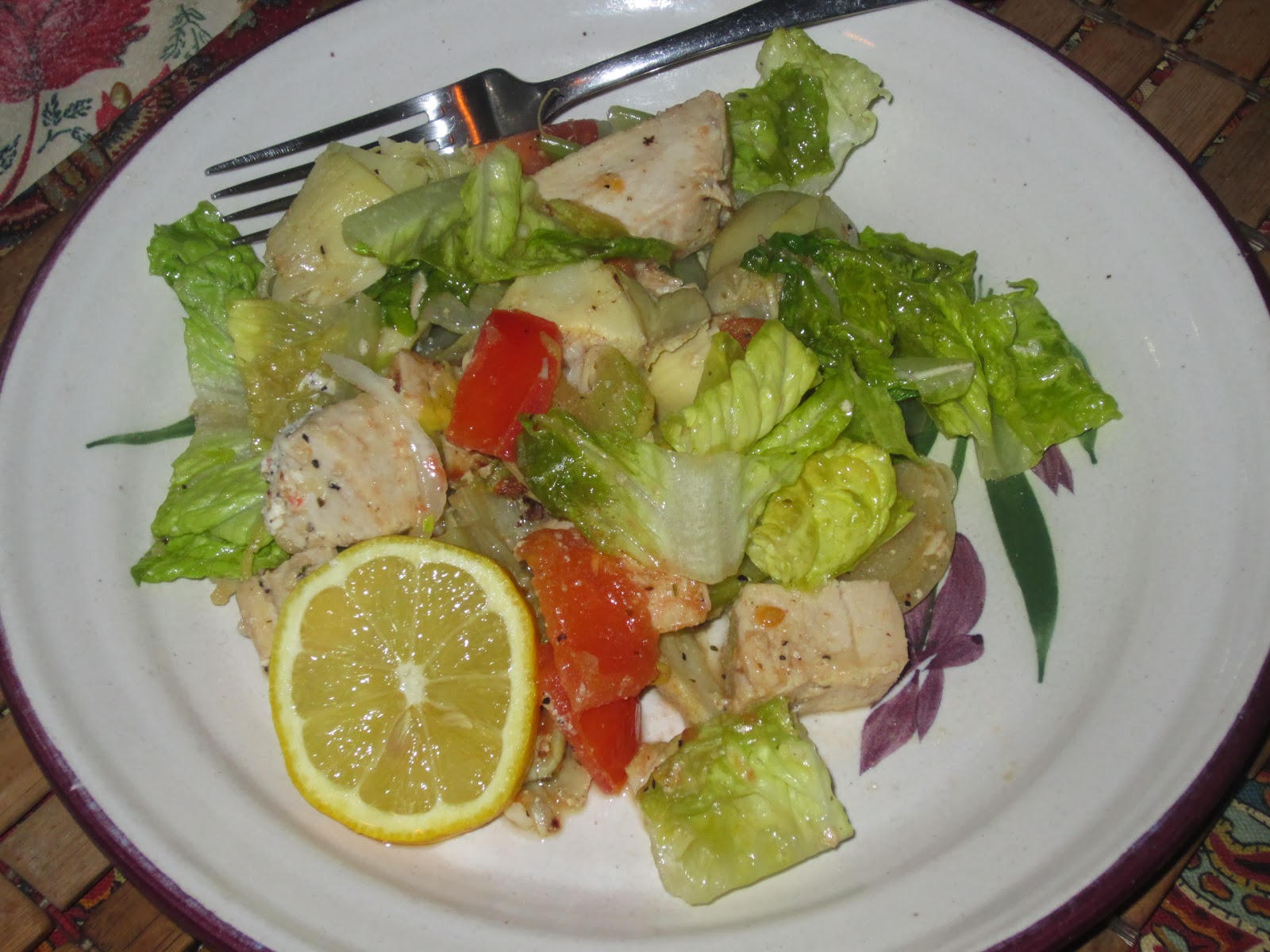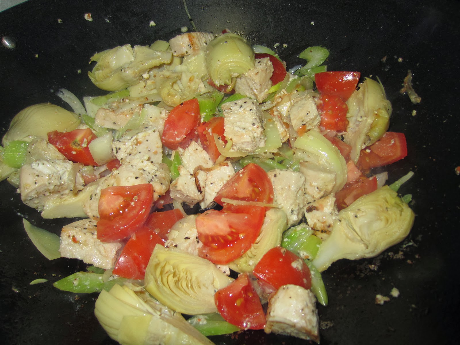 Chicken breast is not my favorite and nothing could be further from exciting in my mind but I really liked the idea of this ranch lemon pepper meat in a dinner salad. But that next night I wasn't up for a cold salad. The sun hasn't exactly been that present in New York yet this March so warm food still sounds good. So, born was the Wilted Ranch Lemon Pepper Chicken Salad.I cut two of the breasts into big-bite chunks and heated through with some celery, onion and then just for a few minutes at the end, chunked fresh roma tomatoes, artichoke hearts and big hunks of romaine lettuce.
